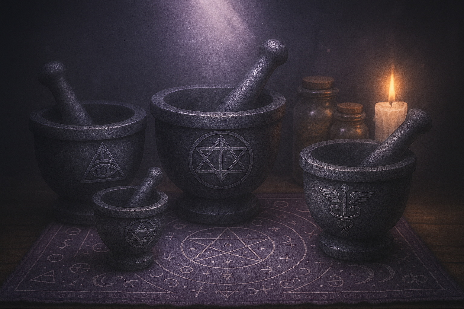 Utilisé pour préparer poudres rituelles, encens, mélanges végétaux ou symboliques, le mortier se tient près de l’autel comme un lieu de préparation sacrée. Pierre pour la stabilité et la mémoire, bois pour la douceur et l’ancrage, métal pour la précision, chaque matière influe sur le travail. Le pilon, par son va-et-vient, inscrit l’intention dans la matière jusqu’à ce qu’elle soit prête à être offerte ou transformée.